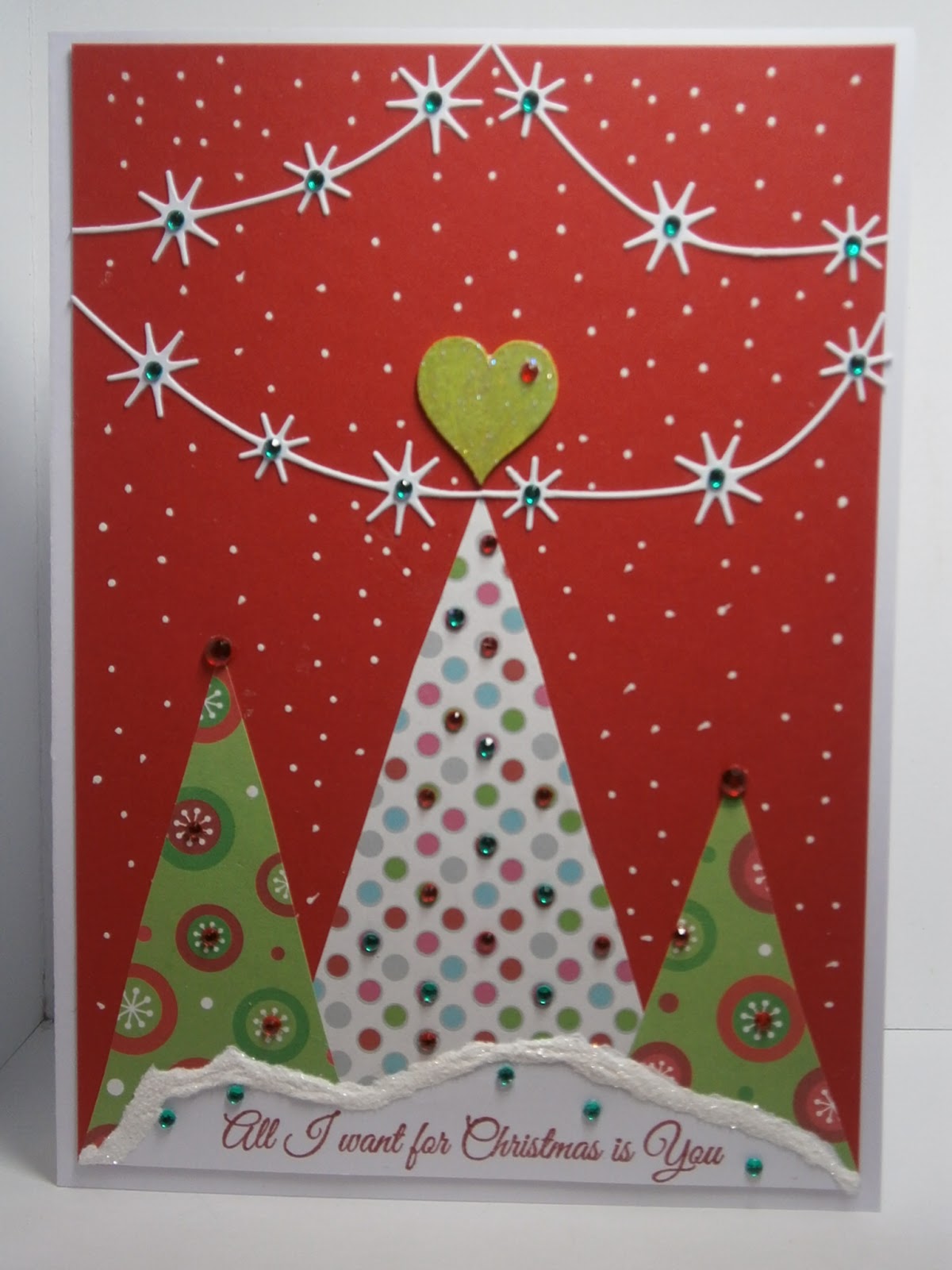 My hand cut Christmas Trees are from snippets of, very old, leftover Christmas paper. The snow hill is torn from a scrap of white card and edged with dries white glue and glitter. The heart is a wooden one from my stash and I painted it green to match the trees then added Stickles for sparkle and the little gem. The starry banners are Tinsel Ropes by Memory Box and are cut from scraps. The sentiment is from a lovely clear set from Casual Fridays called Must Love Snowflakes and I added lots of stones and snow with a white gel pen.